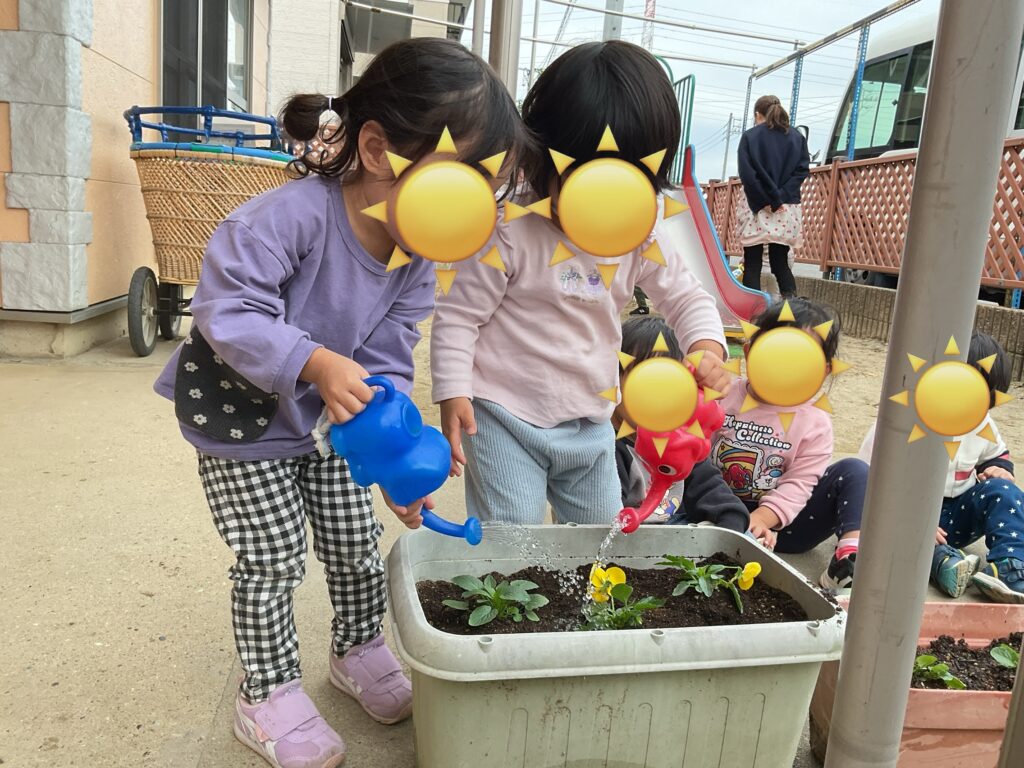 「花の苗を植えました!」みんなで花の苗を植えました。0、1歳児クラスは保育士と一緒にスコップを持って土を被せたり、水やりを行いました。2歳児クラスは好きな苗... -